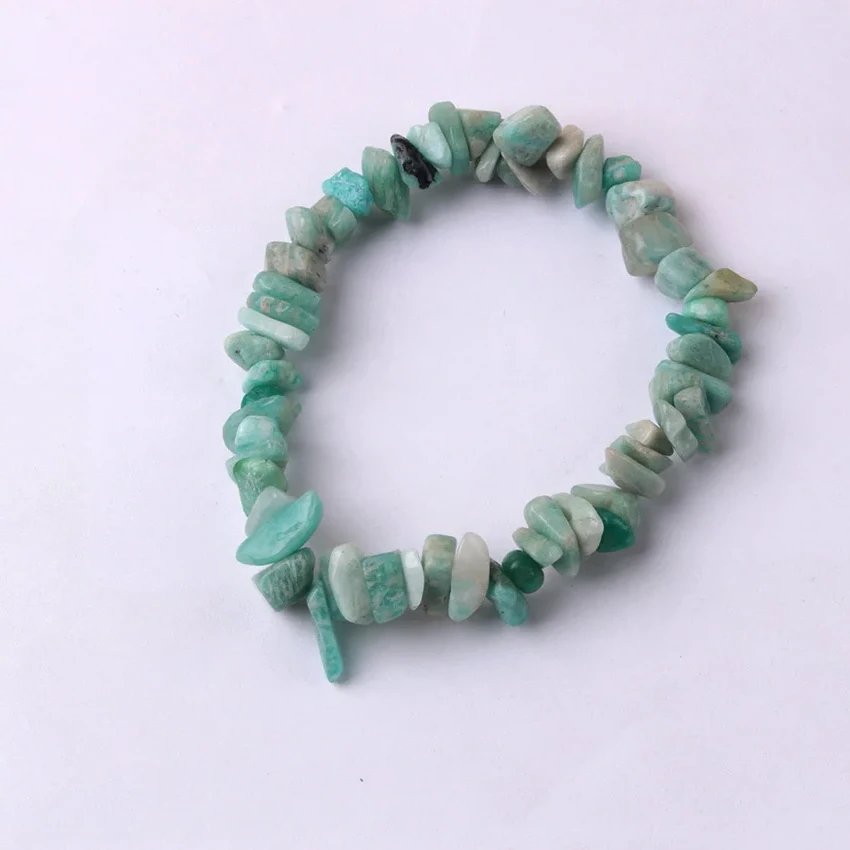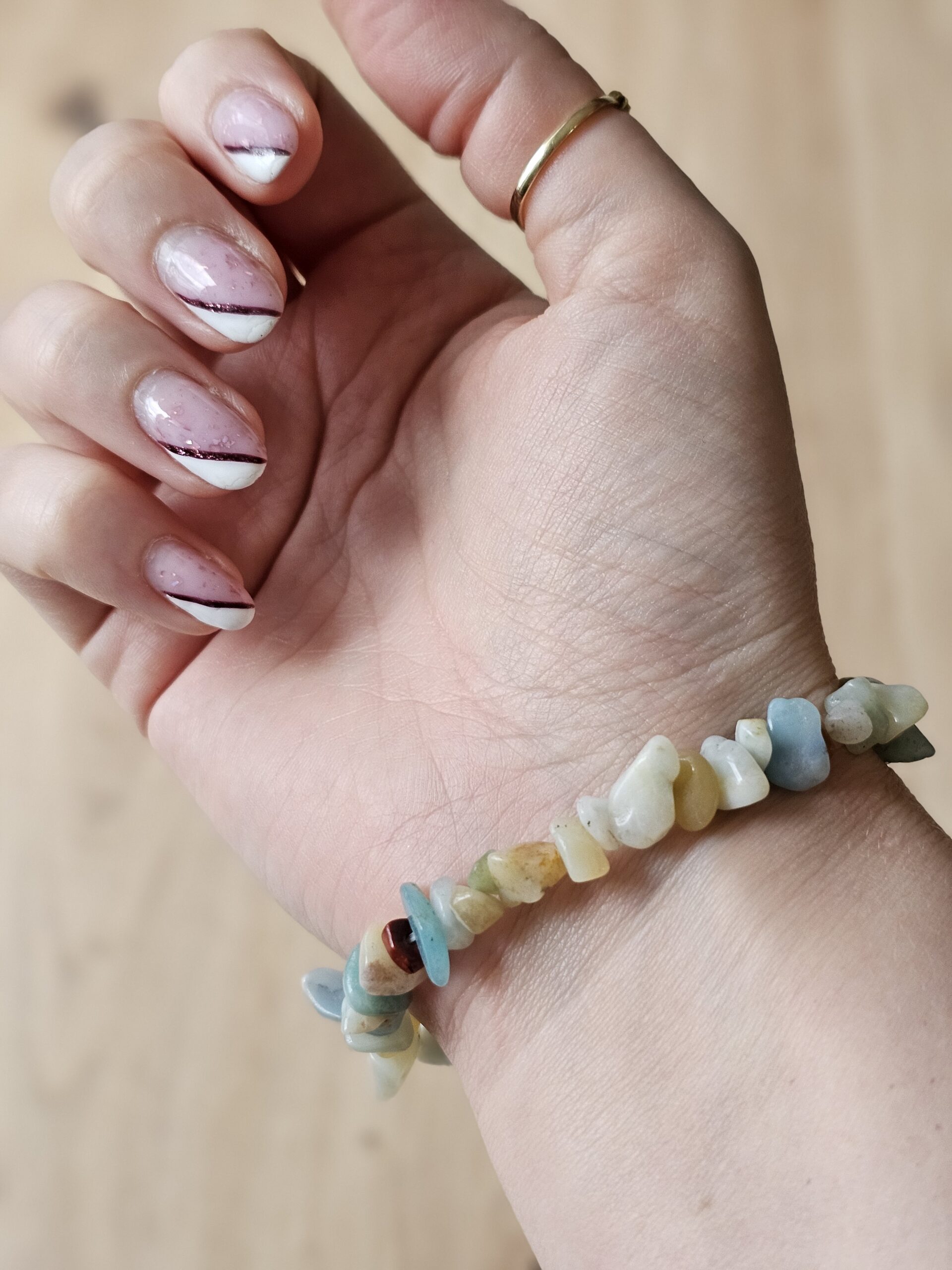 Bransoletka wykonana jest z naturalnych bryłek amazonitu, których barwy przechodzą od miękkiego błękitu po odcienie zieleni. Każdy kamień ma unikalny kształt i tonację, dzięki czemu biżuteria zachowuje autentyczny, surowy wygląd. Delikatny połysk nadaje jej subtelnej elegancji i lekkości.