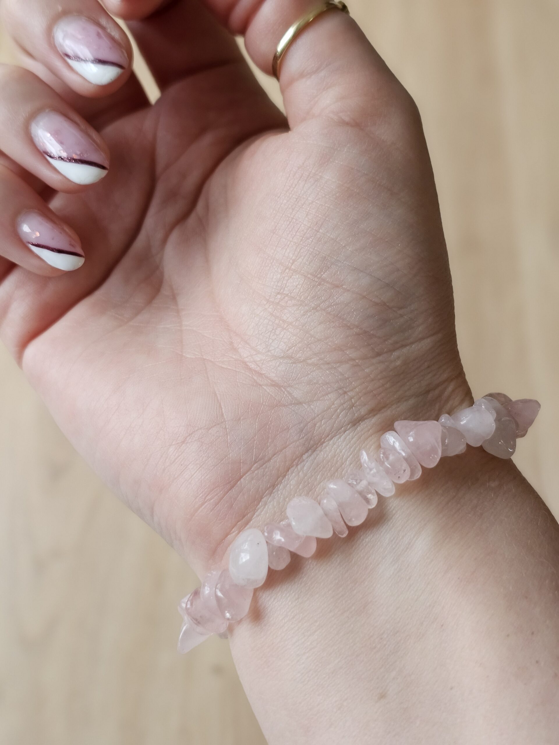 Bransoletka wykonana jest z naturalnych bryłek różowego kwarcu o mlecznoróżowych tonach. Każdy kamień ma nieco inny kształt i przezroczystość, co nadaje biżuterii unikalny, autentyczny wygląd. Surowa forma podkreśla jej prostotę i subtelność, dzięki czemu pasuje do każdej stylizacji.