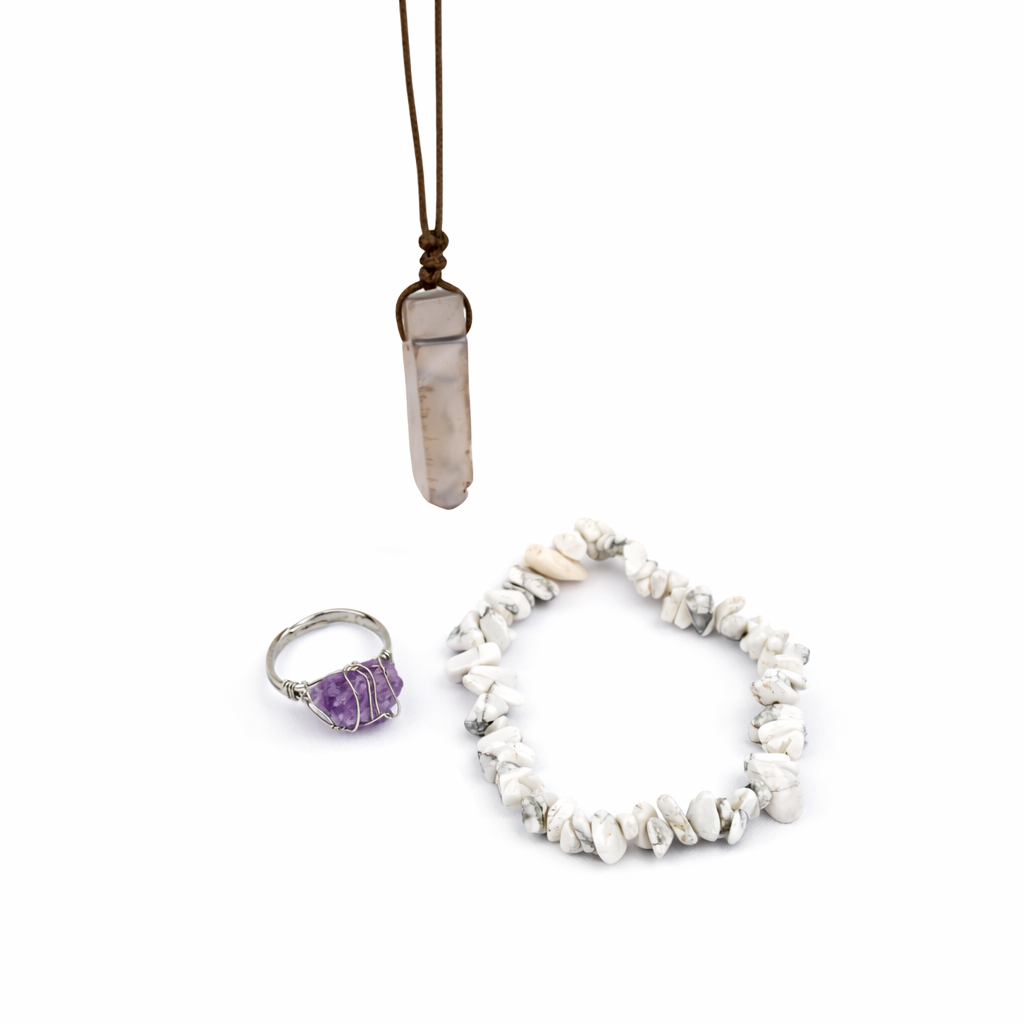 Zestaw został stworzony dla Ryb, którym szczególnie sprzyjają szary agat, ametyst i howlit. Ich wspólna energia wspiera intuicję, emocjonalną harmonię i duchową głębię – cechy naturalnie obecne u tego znaku wody.