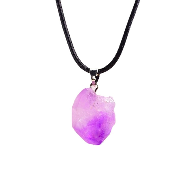 Wisiorek z naturalnego ametystu ma polerowaną powierzchnię i szlachetny fioletowy kolor – od delikatnych lawendowych tonów po ciemniejsze odcienie purpury. Każdy kamień jest niepowtarzalny, z własnym układem barw i subtelnymi refleksami. Naszyjnik łączy naturalne piękno z prostotą formy.