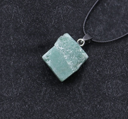 Wisiorek wykonany z naturalnego awenturynu ma polerowaną powierzchnię i łagodny, zielony kolor z delikatnymi przebarwieniami. Każdy kamień jest unikalny – natura nadaje mu subtelne różnice w odcieniu i strukturze, dzięki czemu każdy egzemplarz ma indywidualny charakter.