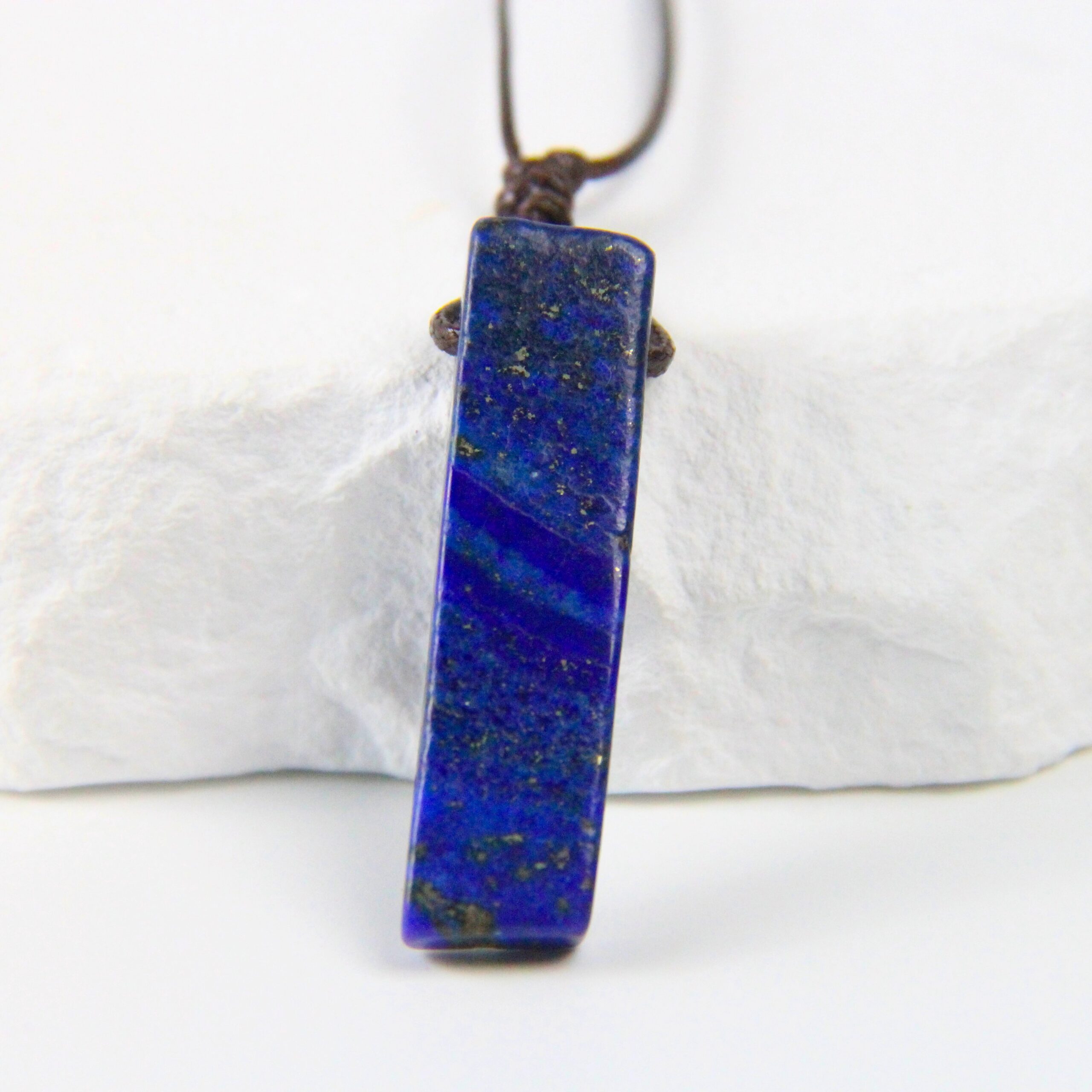 Wisiorek w geometrycznym kształcie wykonany z naturalnego lazurytu ma polerowaną powierzchnię i nasycony, niebieski kolor z subtelnymi, złotawymi drobinkami pirytu. Każdy egzemplarz jest wyjątkowy, a jego barwy i wzory podkreślają naturalny, szlachetny charakter kamienia.