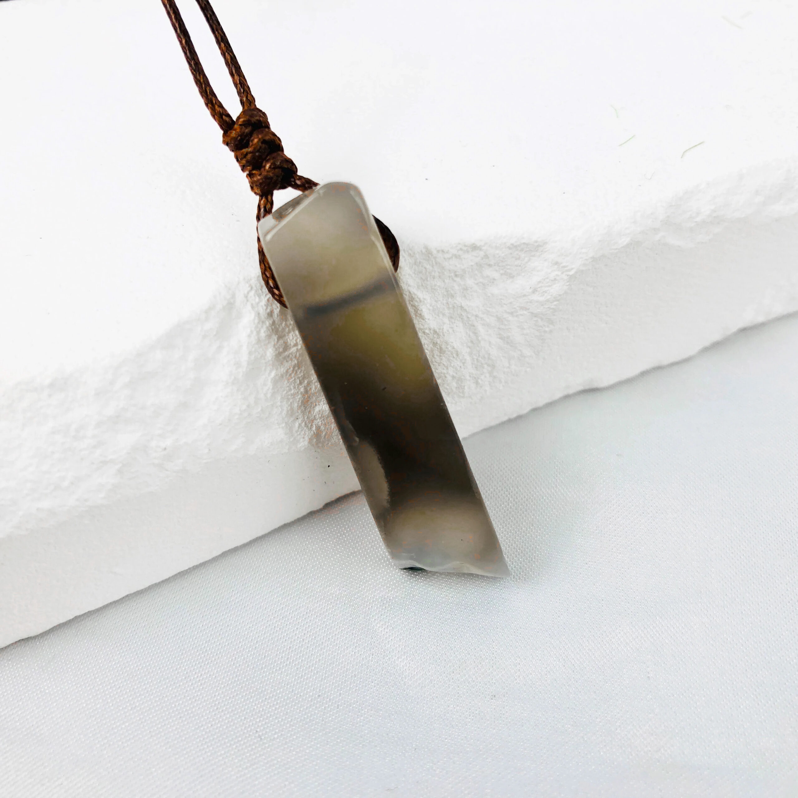 Naszyjnik wykonany z szarego agatu o delikatnym, mlecznym odcieniu. Geometryczny kształt kamienia nadaje mu nowoczesny wygląd, a subtelny połysk sprawia, że pasuje zarówno do codziennych, jak i eleganckich stylizacji.