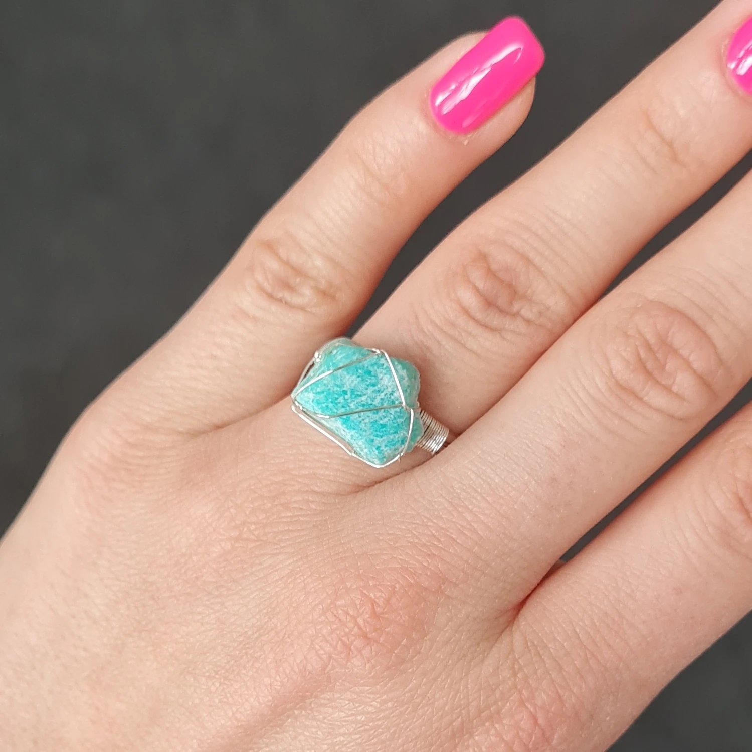 Pierścionek wyróżnia się niebiesko-zielonym odcieniem amazonitu – barwą kojarzoną z wodą i spokojem. Gładka powierzchnia kamienia podkreśla jego naturalne piękno, a każdy egzemplarz różni się subtelnie tonacją i strukturą, co czyni go wyjątkowym.