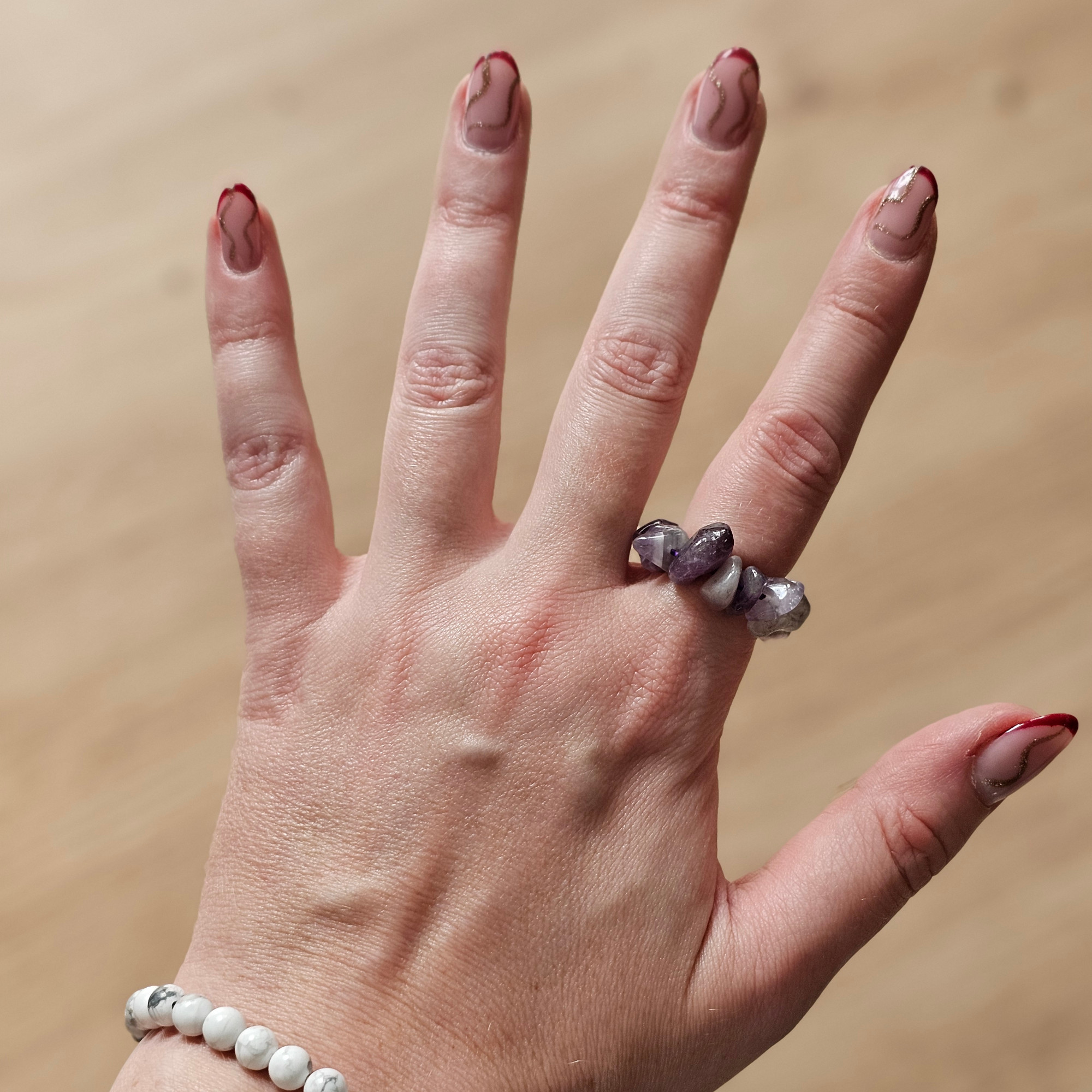 Pierścionek wykonany jest z małych, surowych odłamków ametystu w odcieniach fioletu – od jasnych po głębokie tony. Każdy kamień ma własny kształt i połysk, dzięki czemu każdy pierścionek jest unikalny. Elastyczna konstrukcja dopasowuje się do dłoni, zapewniając komfort noszenia.