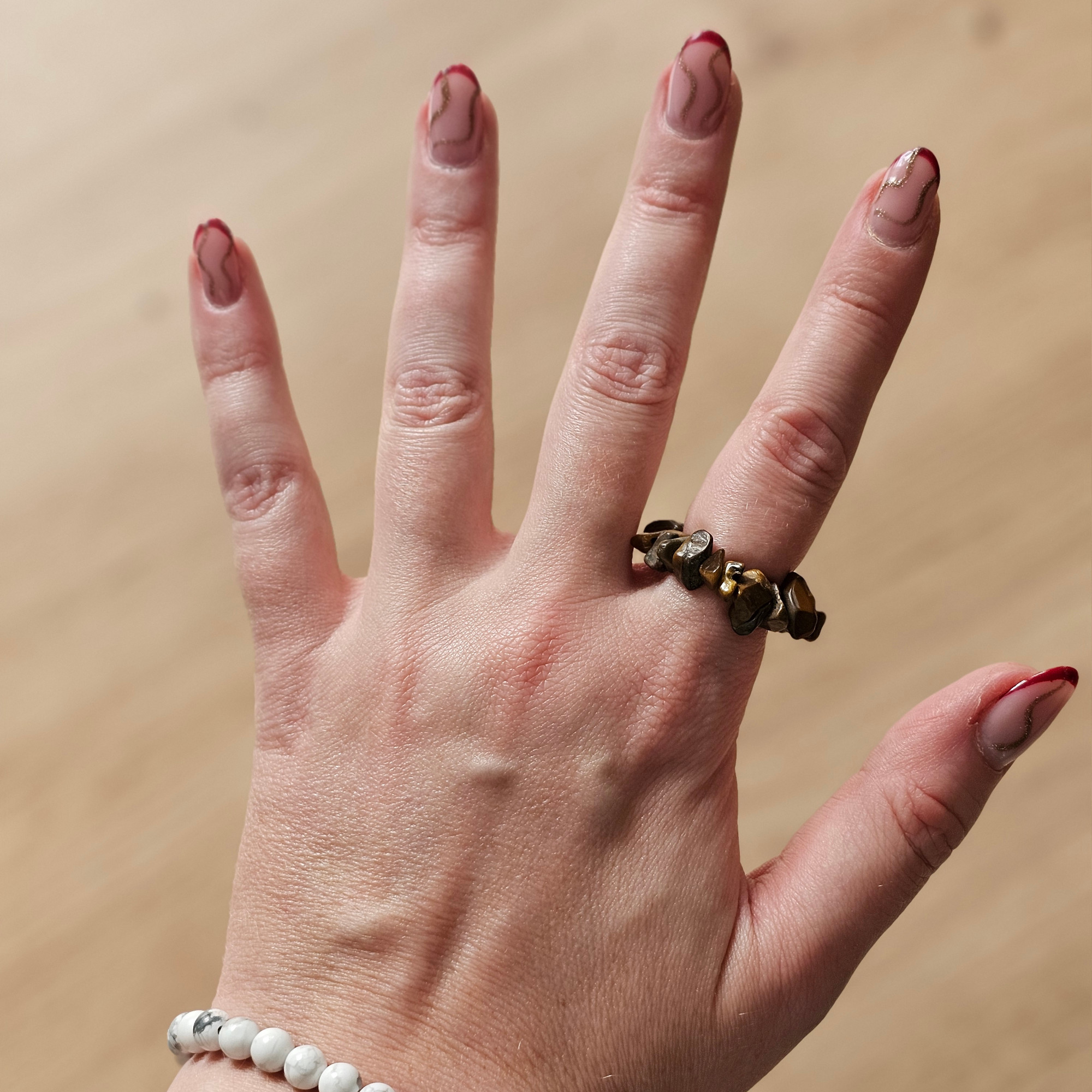 Pierścionek składa się z naturalnych odłamków Tygrysiego Oka o złocisto-brązowych pasmach, które połyskują przy każdym ruchu dłoni. Każdy kamień ma unikalny układ barw, dzięki czemu biżuteria nabiera wyjątkowego, naturalnego charakteru. Elastyczna forma pozwala na wygodne dopasowanie do palca.