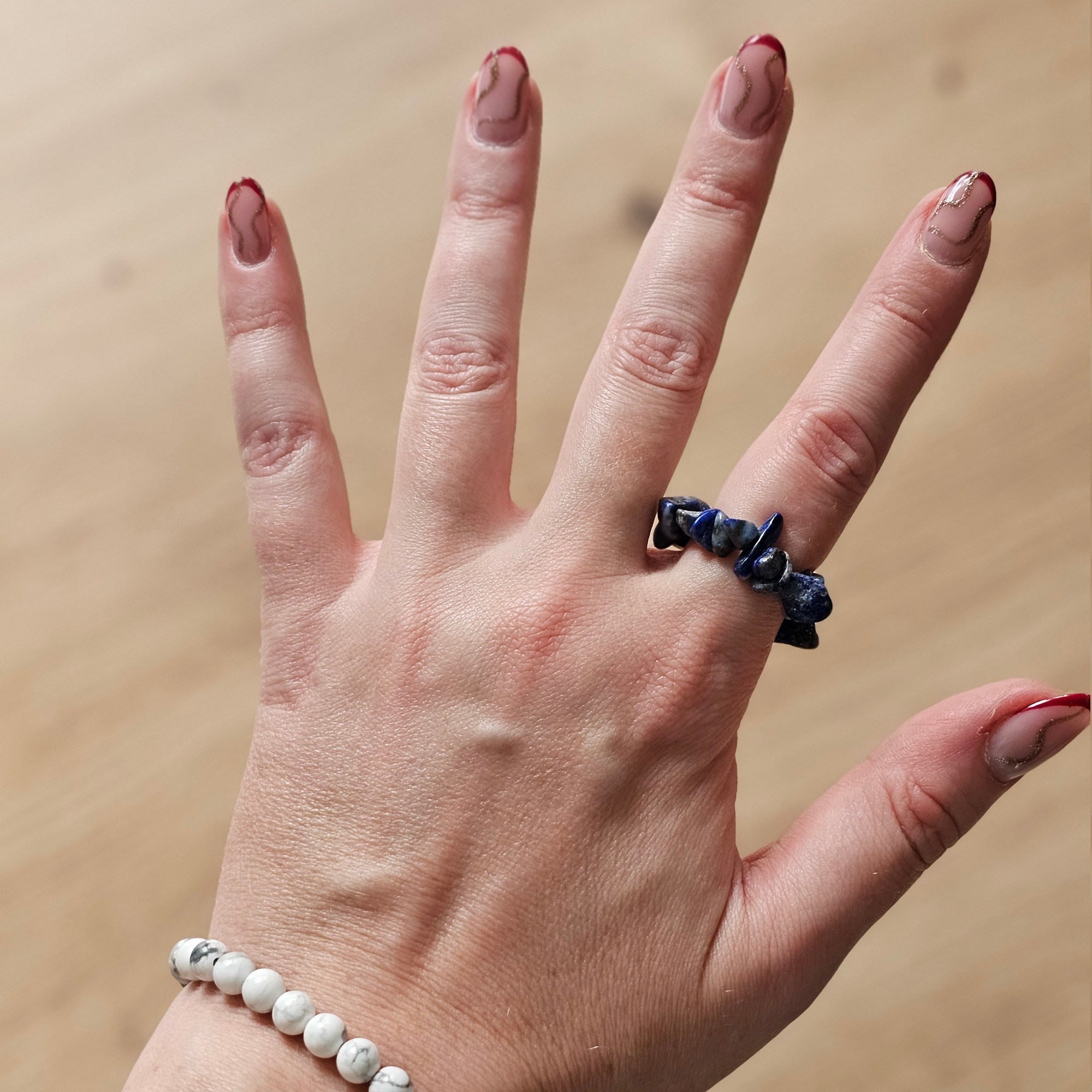 Pierścionek składa się z naturalnych odłamków lazurytu o intensywnej, błękitnej barwie z drobnymi, złocistymi refleksami. Każdy kamień ma nieco inny kształt i ton, dzięki czemu biżuteria jest jedyna w swoim rodzaju. Elastyczna konstrukcja dopasowuje się do dłoni, zapewniając komfort noszenia.