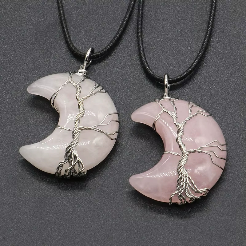 Różowy kwarc półksiężyc. Naszyjnik z bryłą strasu w kształcie półksiężyca.