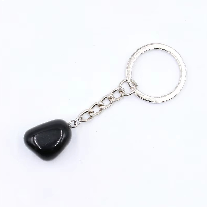 Brelok wykonany z autentycznej bryłki obsydianu o intensywnie czarnej, szkliście lśniącej powierzchni. Kamień zachowuje surową formę, z delikatnymi refleksami światła. Każdy egzemplarz ma unikalny kształt i odcień, co podkreśla jego naturalne pochodzenie.