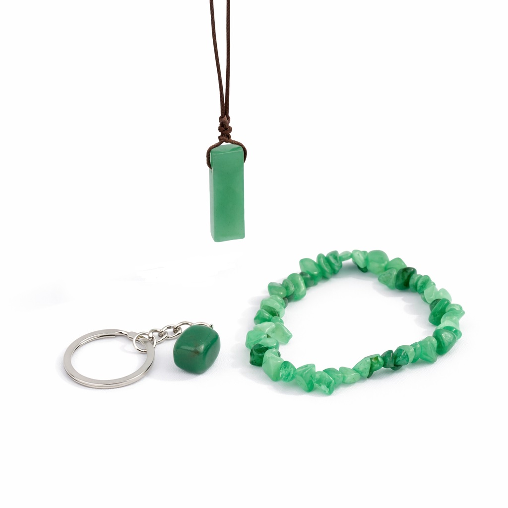 Zestaw z zielonym Awenturynem to połączenie dobrobytu, optymizmu i harmonii. Trzy elementy – naszyjnik, bransoletka i zawieszka – tworzą spójną całość, która wspiera rozwój osobisty, otwartość na nowe możliwości i odwagę w podejmowaniu decyzji. Awenturyn równoważy emocje i wprowadza wewnętrzny spokój, pomagając w budowaniu pozytywnego nastawienia do życia.